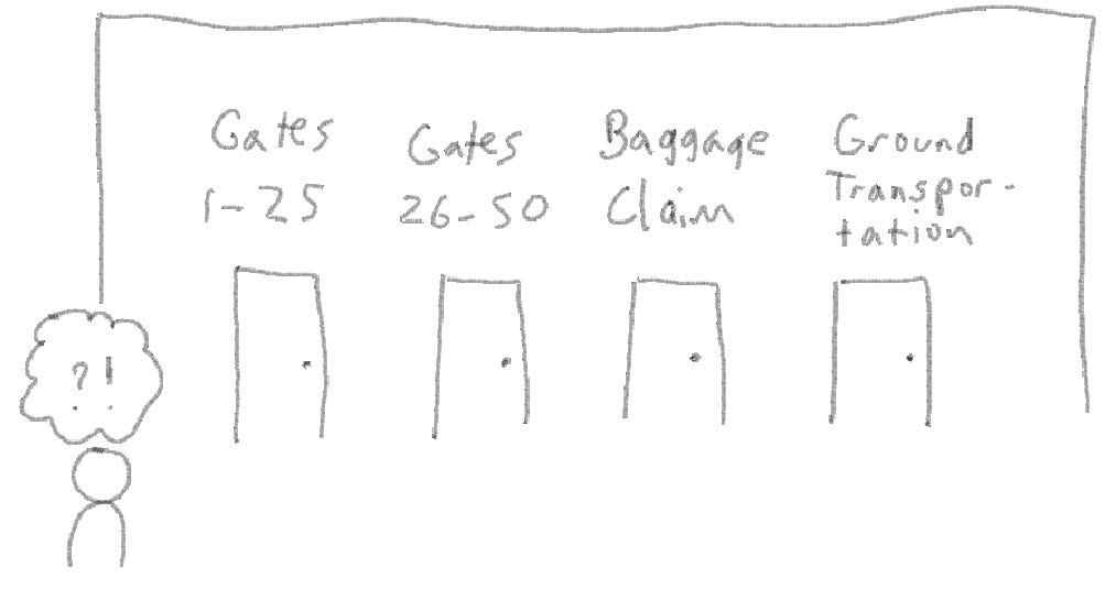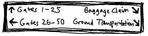 First, we expect them to cover all the options. It should be a menu of all the possibilities—or at least, in conjunction with smaller signs for things like restrooms and such. If the sign didn’t mention how to get to the gates, for example, then at best the info desk would be overwhelmed, and at worst people would wander around absurdly, missing flights and getting angry.